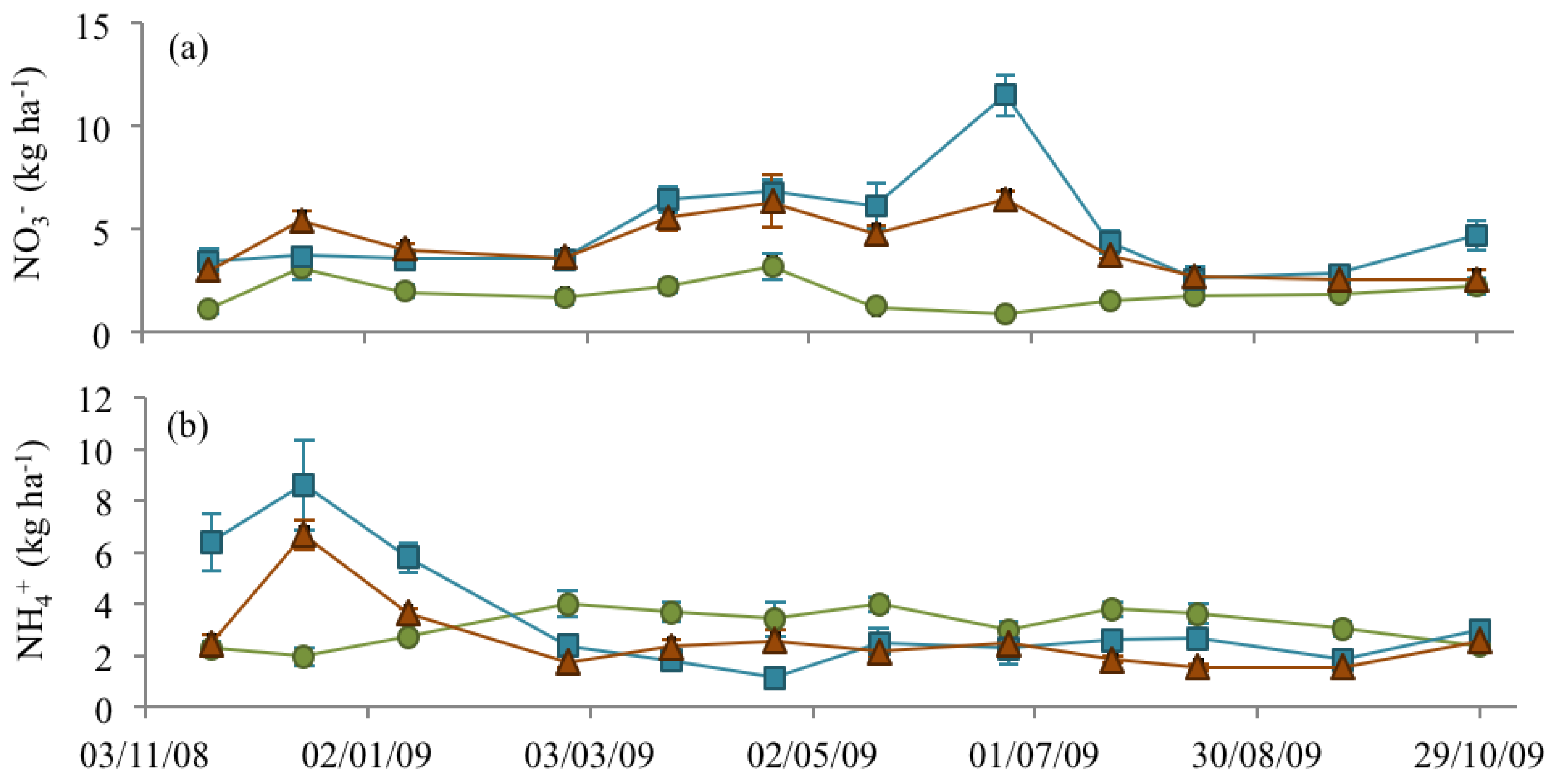 Figure 5 illustrates soil NO3− (Figure 5a) and NH4+ (Figure 5b) concentrations from all three treatments. Soil NO3− (0–10 cm) was measured monthly (n = 8). G frequently contained the lowest mean concentrations, the least being 0.9 kg·ha−1 measured on 24 June 2009. Both NM and EM tended to contain higher concentrations of NO3−, with the highest (11.5 kg·ha−1) being measured in NM on 24 June 2009. Analysis by repeated measure two-way ANOVA showed land use (p < 0.0001, df = 2), time (p < 0.0001, df = 43), and interaction (p < 0.0001, df = 86) to all have a significant effect on soil NO3− concentration. Comparing each individually by Bonferroni post-test found a greater number of dates with significantly different soil NO3− concentrations between G and NM (7), and G and EM (6) than NM and EM (2), with the majority of differences occurring between March and July.
