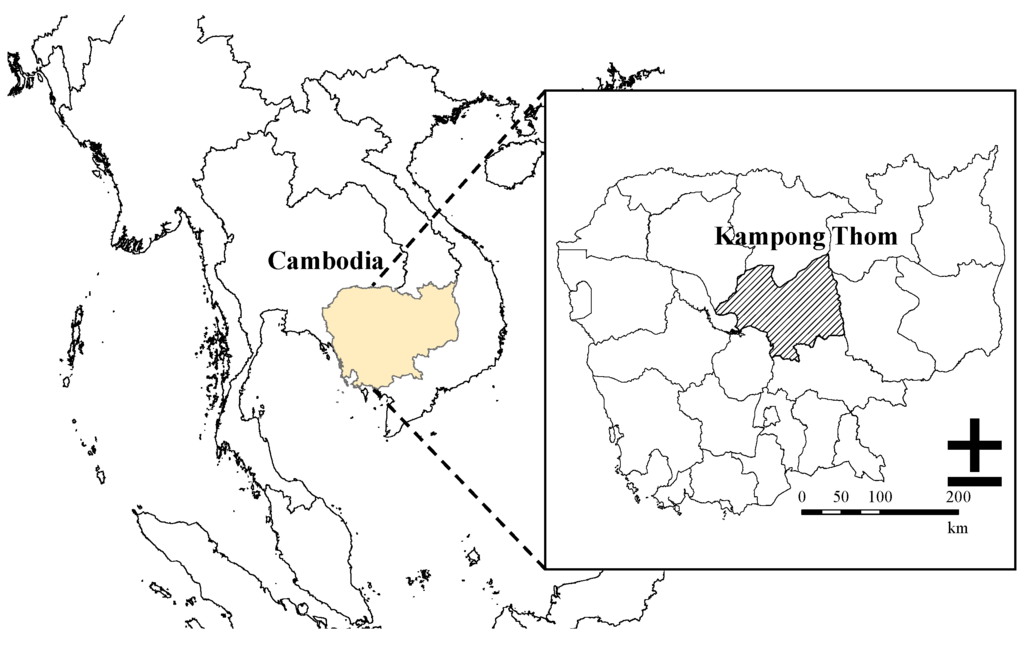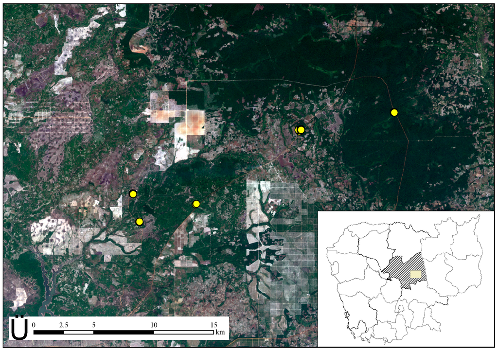 The study area is in Kampong Thom Province, central Cambodia (Figure 1). This province is 1,244,764 ha in area. The rainy season is May through October and the dry season November through April, with 1700 mm annual precipitation [24]. Topography is lowland and nearly flat, with elevations from 1 to 80 m above sea level. The study area has three forest types, evergreen, degraded evergreen, and deciduous. Degraded is defined here as an evergreen forest with evidence of illegal logging (e.g., stumps) from field survey.