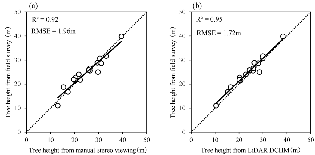 Compared with previous studies using airborne LiDAR, aboveground biomass estimation from manual stereo viewing can be comparable with that of airborne LiDAR data. Mascaro et al. [30] reported that the accuracy of aboveground carbon density estimation using these data was R2 = 0.84 and RMSE = 17 Mg∙C/ha, corresponding to 17.6% of the mean density in Panama. For biomass estimation in the United States, Lefsky et al. [6] reported R2 = 0.80 and RMSE = 75.1 Mg/ha, corresponding to 31.8%. These studies suggest that the accuracy of aboveground biomass estimation using tree height from manual stereo viewing in our study (R2 = 0.78 and RMSE = 58.18 Mg/ha, corresponding to 34.0%) is comparable with that of airborne LiDAR estimation, especially in terms of R2.