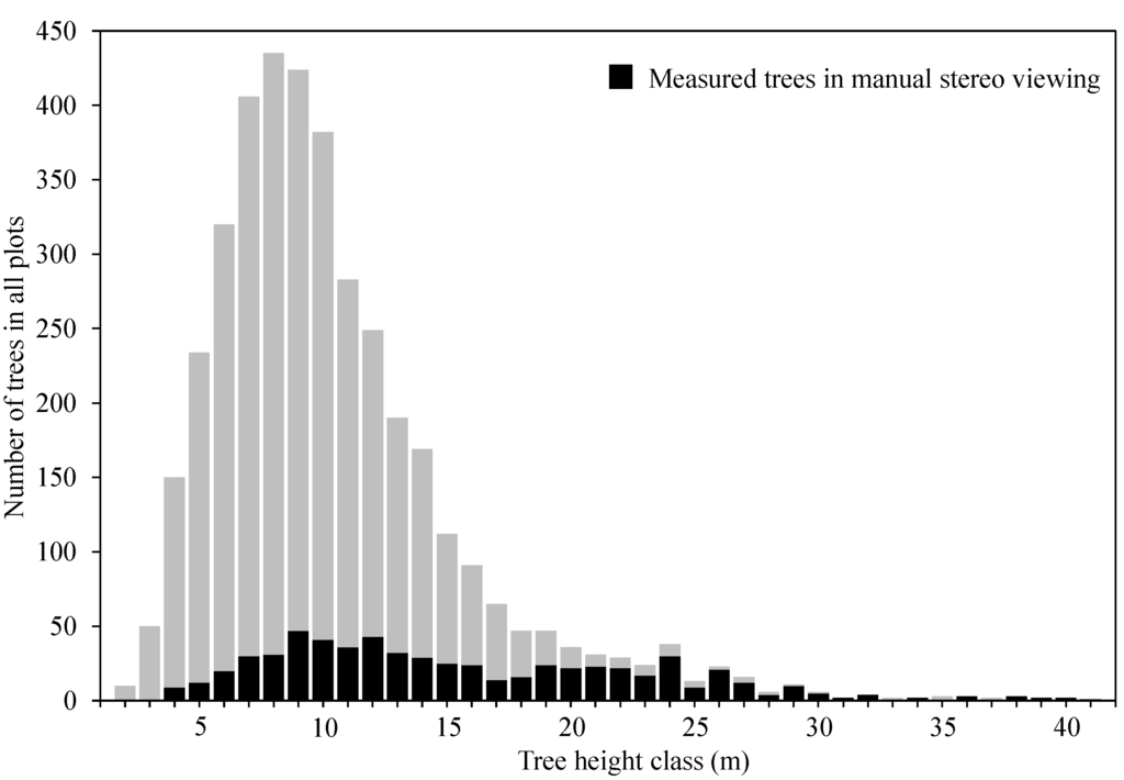 Aerial photographs have been used for many decades in forest inventory [20]. Quantitative and qualitative forest characteristics have been measured by manual methods of stereo photogrammetry (3D methods hereafter) using aerial photographs since the 1940s [21]. Progress in computer science, however, enables production of digital surface models (DSMs) automatically from a stereo pair of digital aerial photographs using stereo matching algorithms similar to those derived from airborne LiDAR first returns. A DSM from high spatial resolution digital aerial photographs can predict tree height, biomass, and other forest structural attributes very accurately, as accurate as airborne LiDAR estimation [22,23]. Progress in computer science also facilitates manual 3D stereo viewing methods on computer displays using digital aerial photographs and shuttered glass (manual stereo viewing hereafter), similar to conventional 3D methods using misreading-prone and a skill-demanding parallax bar on a hardcopy image. Manual stereo viewing is intuitive and there is no need for technical skills for measurement. Thus, investigation of tree height measurement and biomass estimation accuracy of manual stereo viewing may furnish another means for estimating carbon stocks and another option for forest monitoring systems. Nevertheless, there is very little research on this accuracy.