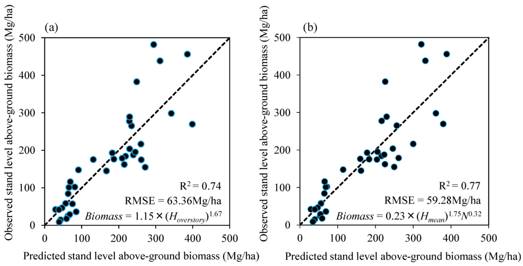 Table 2 shows the result of regression analysis based on all measured trees from manual stereo viewing. This analysis showed that logarithmic mean overstory height (Equation (3)) was the best single explanatory variable for biomass estimation (AIC = 429.2 and R2 = 0.74). RMSE of observed and predicted stand-level aboveground biomass was 63.36 Mg/ha (Figure 5a). For combined tree density and tree height indices, logarithmic mean tree height and tree density per hectare (Equation (4)) were selected as the best aboveground biomass estimation model (AIC = 426.1 and R2 = 0.77); RMSE was 59.28 Mg/ha (Figure 5b). All combination regression models of tree density index and tree height indices improved RMSE and R2 compared with those of the single tree height index.