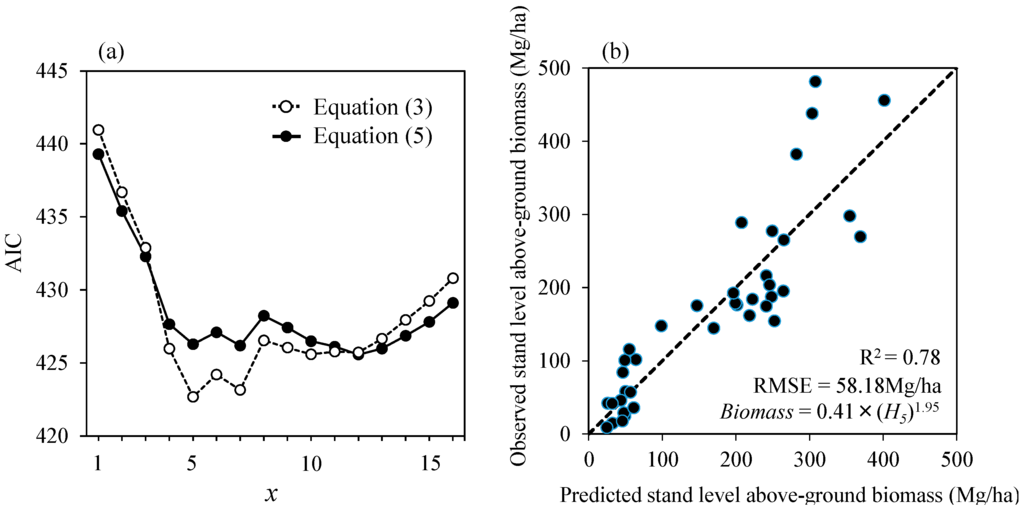 Figure 6 shows the result of regression analysis for mean tree height of the tallest x trees in each plot. Mean tree height of the tallest five trees with logarithmic model (Equation (3)) was the best model (AIC = 422.7 and R2 = 0.78). RMSE of observed and predicted stand-level aboveground biomass was 58.18 Mg/ha, corresponding to 34.0%.