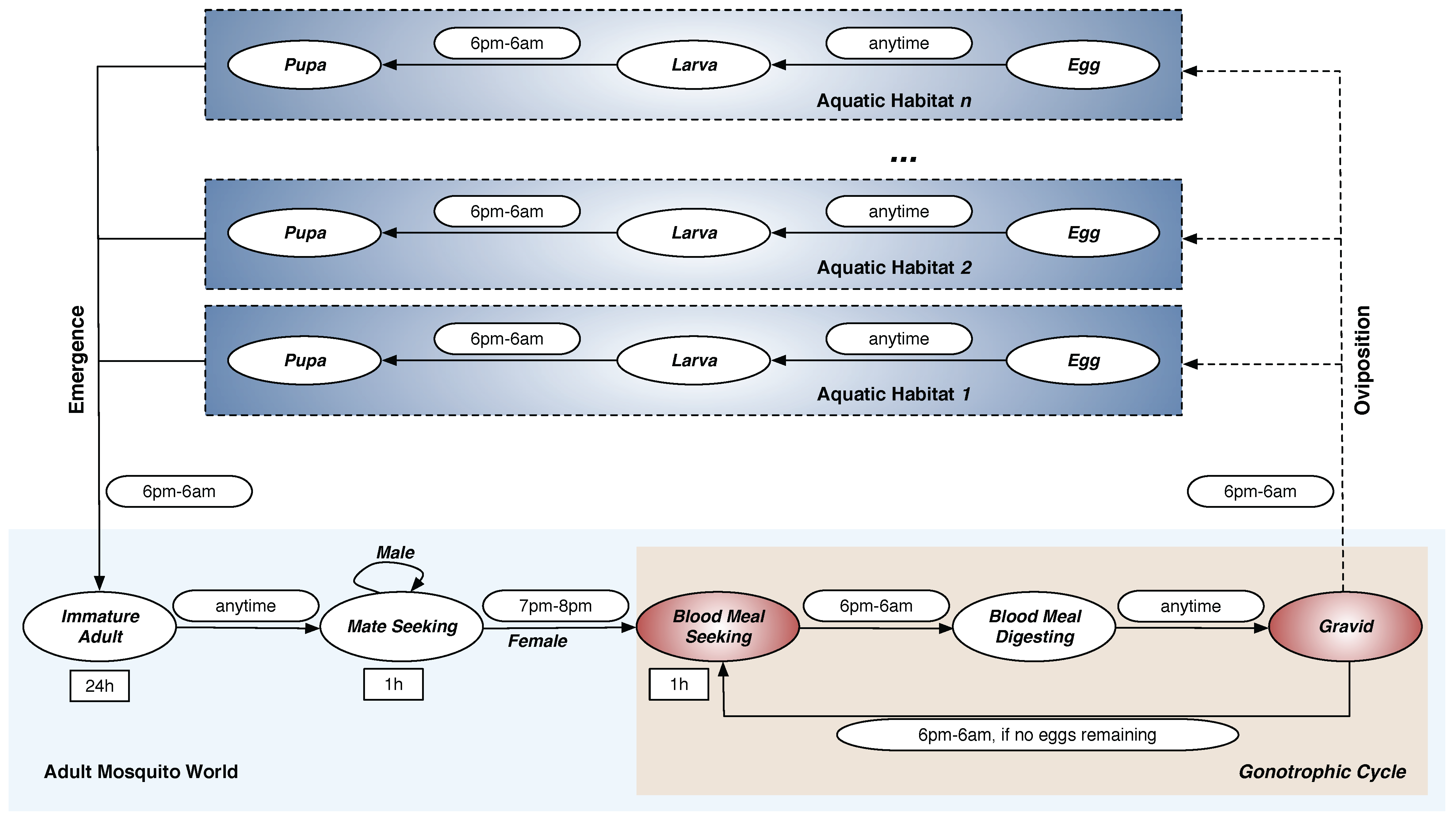 h denotes hour. Permissible time transition windows (from one stage to another) are shown next to the corresponding stage transition arrows as rounded rectangles. Note that adult males, once reaching the