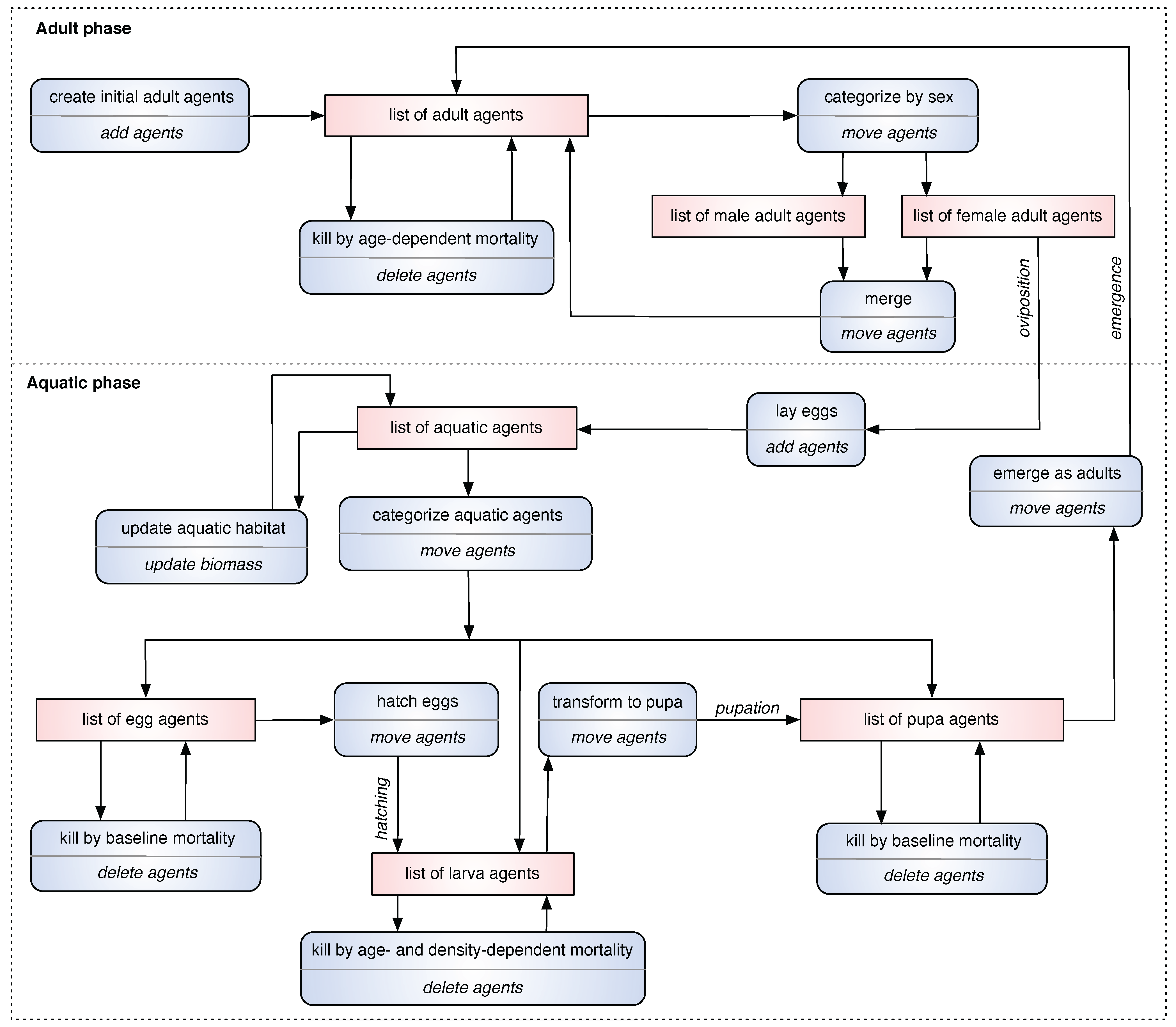In this section, we present a brief overview of the conceptual biological core model (hereafter referred to as the core model) from which the spatial agent-based model (ABM) was developed. The core model describes the population dynamics of An. gambiae, which is regarded as one of the most efficient mosquito species that transmits malaria. Due to its pivotal role in malaria transmission, modeling its population dynamics can assist in finding factors in the mosquito life cycle that can be targeted to decrease malaria transmission to a lower level. The An. gambiae complex, a closely related group of eight named mosquito species found primarily in Africa, includes three nominal species, An. gambiae, An. coluzzii, and An. arabiensis that are among the most efficient malaria vectors known (in this paper, the terms ‘vector’ and ‘mosquito’ are used interchangeably). The model described in this paper has been designed specifically around the mosquito An. gambiae. While the respective ecologies and involvement in malaria transmission among other members of the An. gambiae complex differ in important ways, this model could effectively apply to all three and even to many of the several dozen other major malaria vectors in the world.