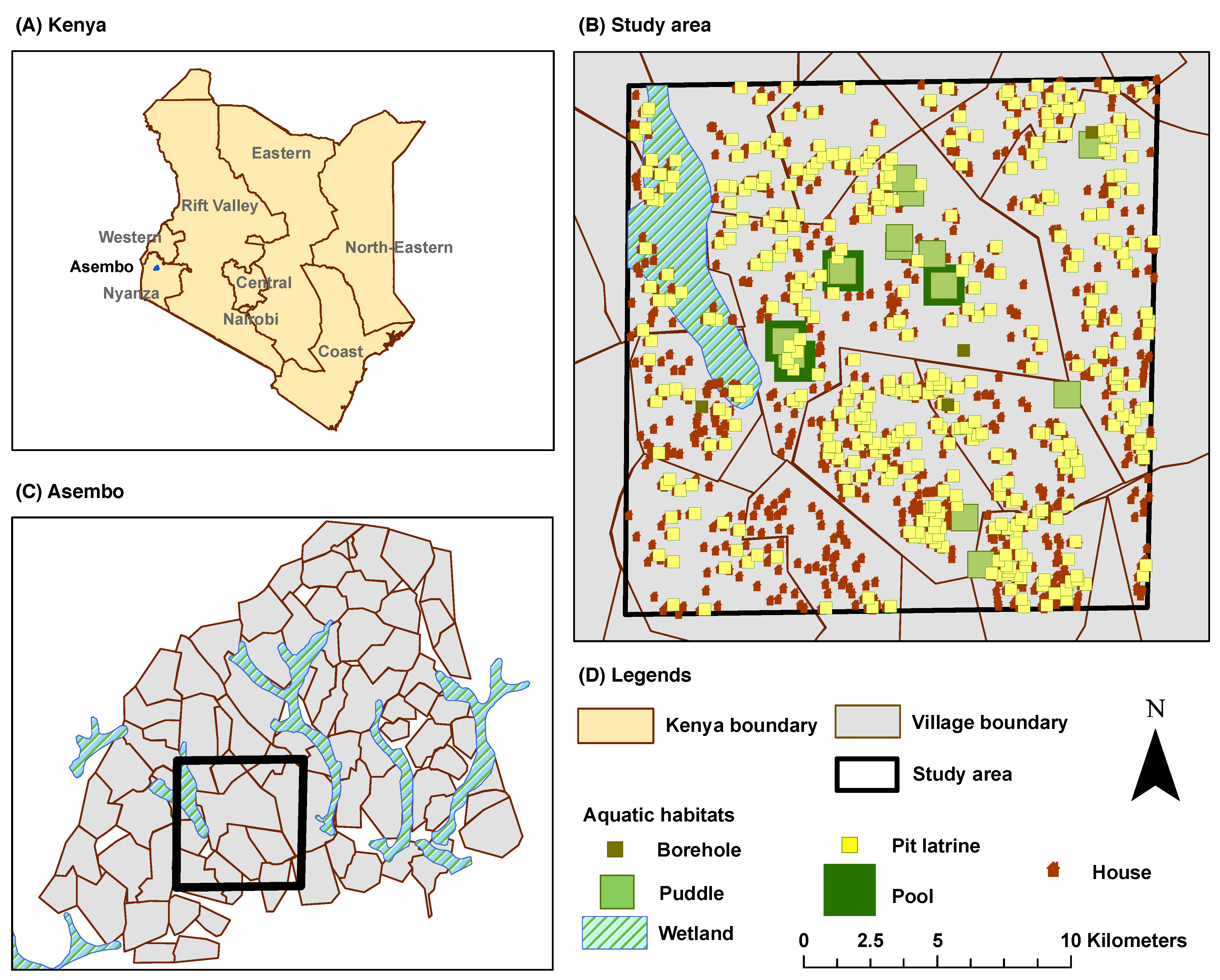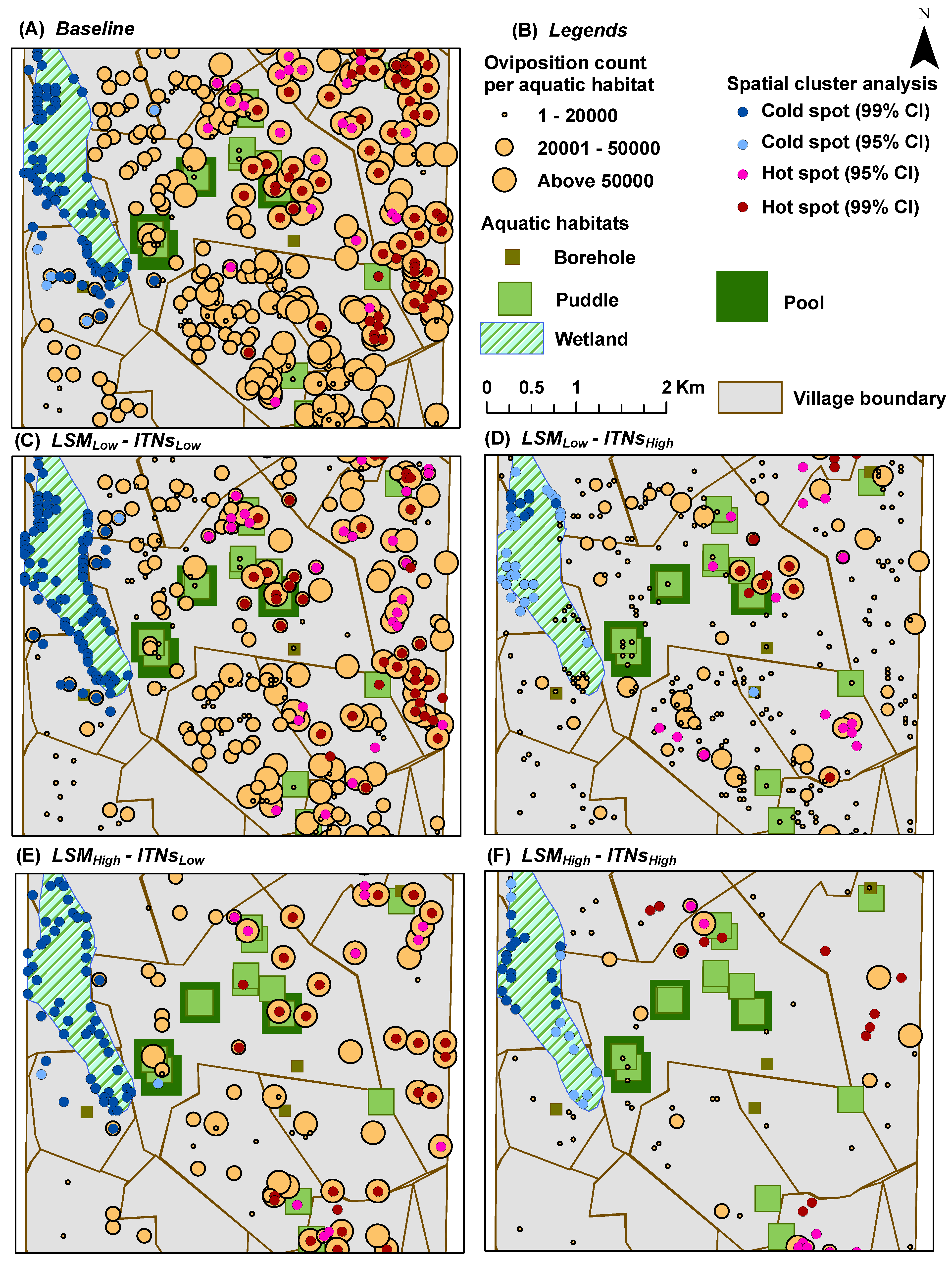Figure 4B, both the eastern portion of the south-west quadrant and most of the eastern edge of the wetlands portray two house clusters with very few or no aquatic habitats (including pit latrines) in the vicinity. As a consequence, these areas contain almost no hot spots, as depicted in the hot spot analysis results (see