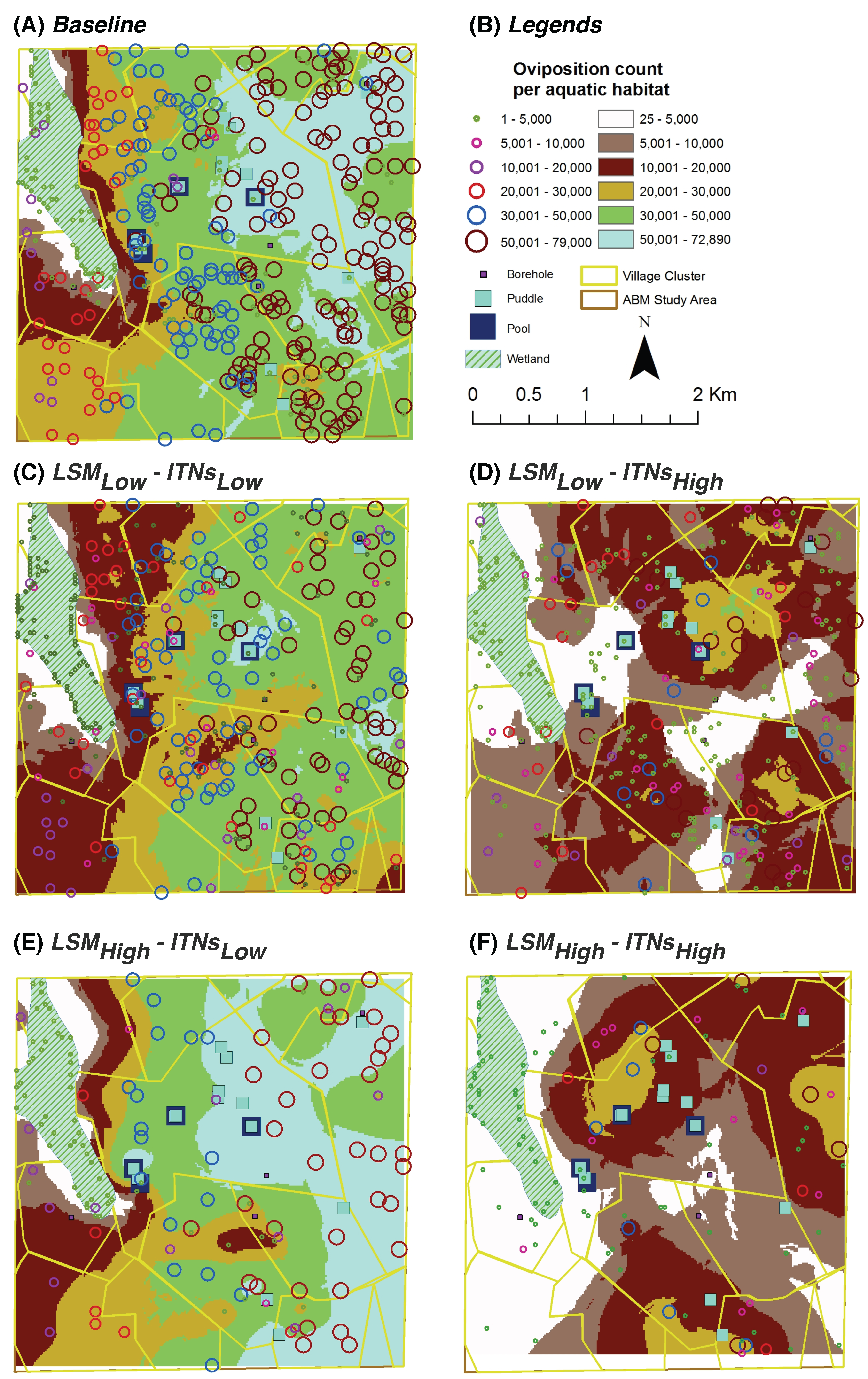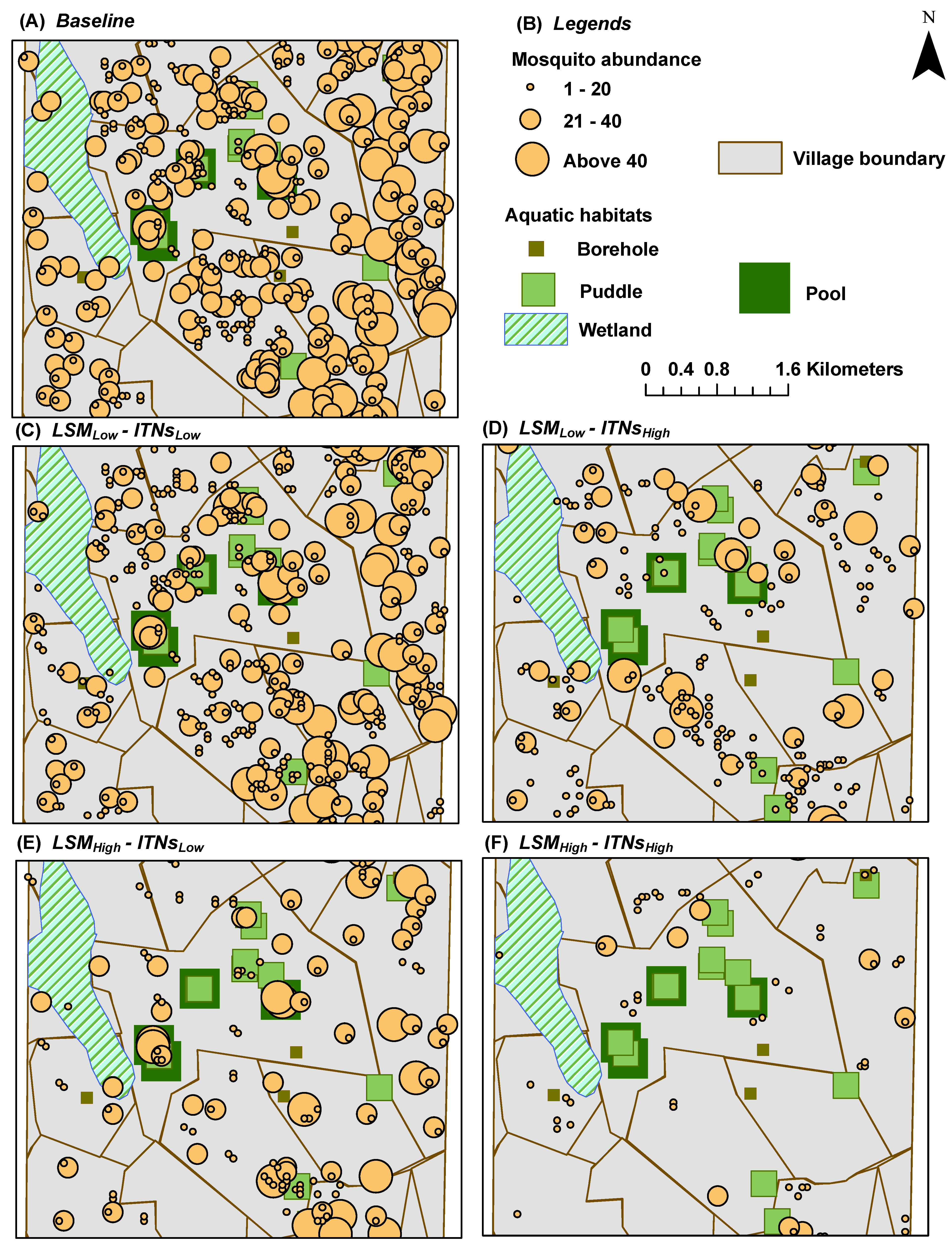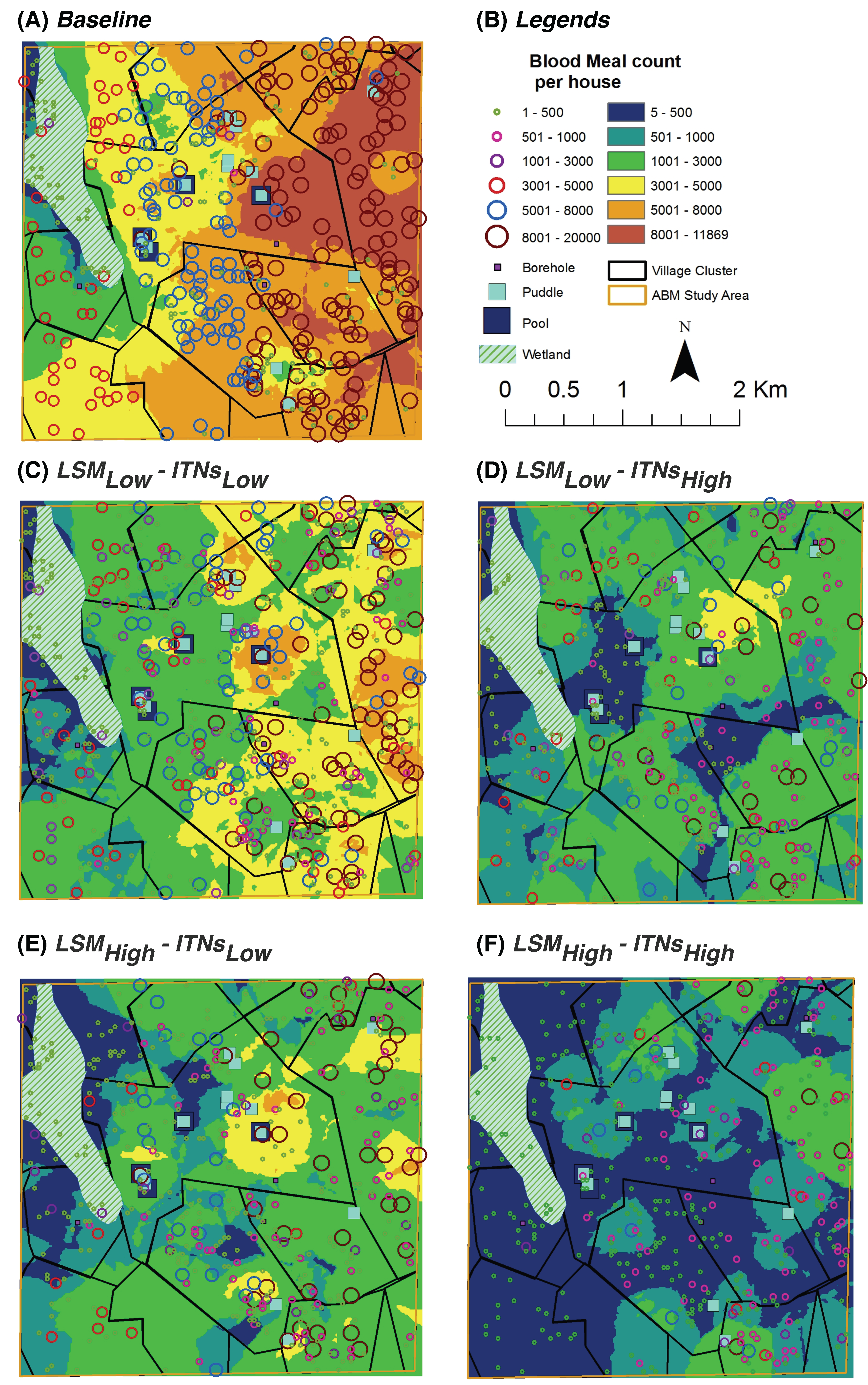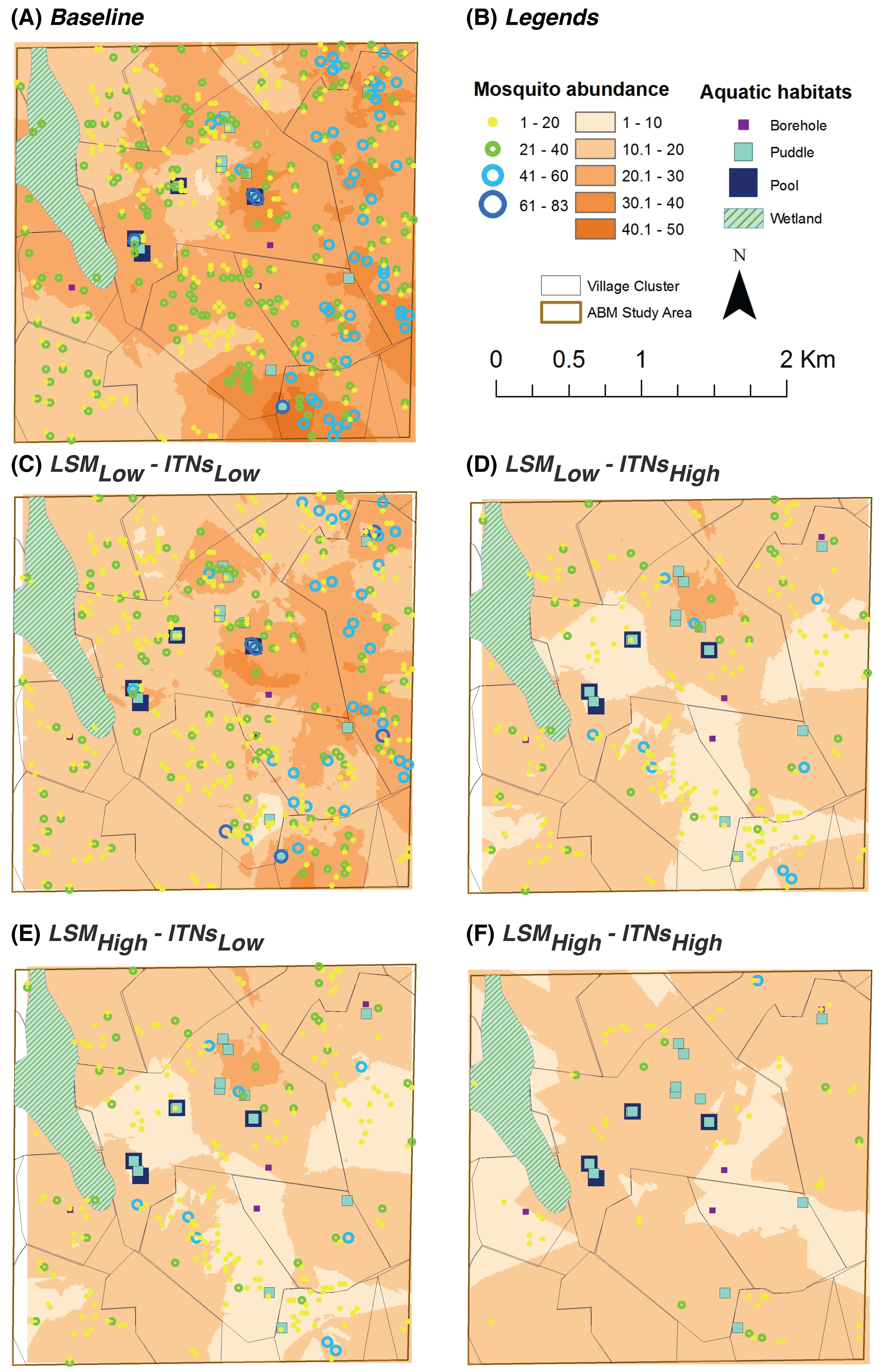 In this study, habitats and houses were selected using random sampling for the vector control interventions. However, given the power of ABMs, other sophisticated, habitat-based strategies for interventions are also equally applicable. For example, latrines and boreholes for LSM, or a firewall of ITNs at the village boundary can be excellent choices to target first or in a limited-resource setting.