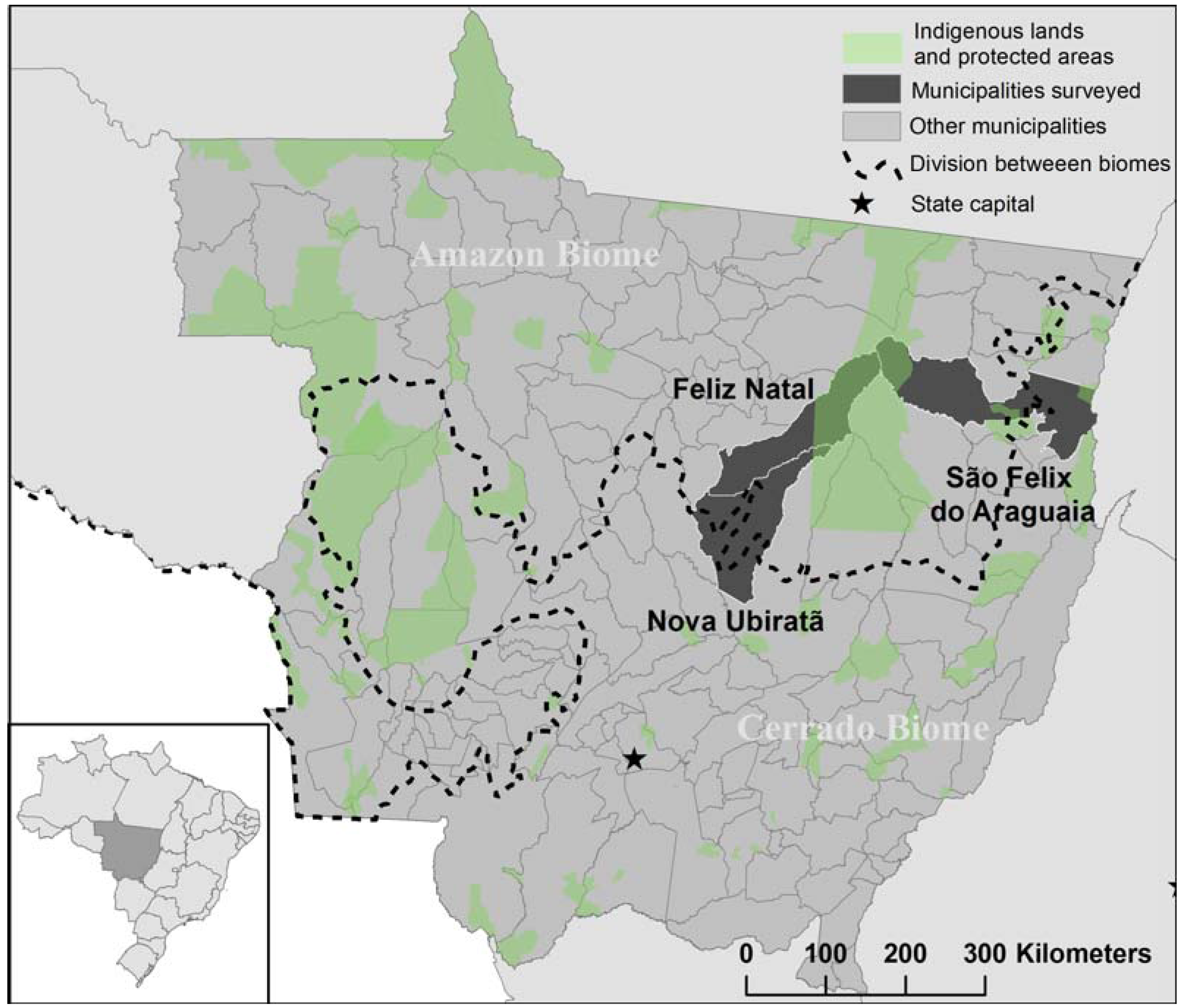 - DeFries, R.; Herold, M.; Verchot, L.; Macedo, M.N.; Shimabukuro, Y. Export-oriented deforestation in Mato Grosso: harbinger or exception for other tropical forests? Philos. Trans. R. Soc. B 2013. [Google Scholar] [CrossRef] [PubMed]