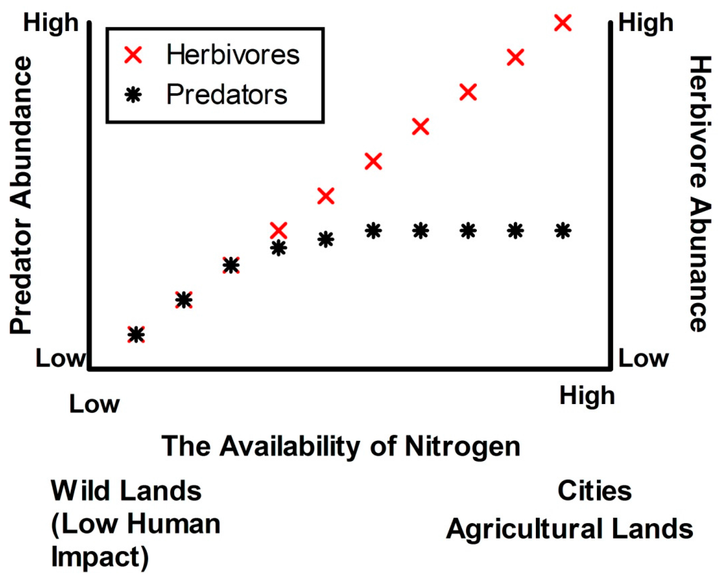 At low levels of N availability the positive effects of N fertilisation flow with efficiency through the trophic web. However, as Nr pollution increases, there is a decoupling of herbivore and predator production. This decoupling is the result of: (1) nitrogen promoting weed growth, which gives herbivores a place to hide from predators; and (2) nitrogen improving the growth of individual herbivores placing them beyond the handling size of many predators.
