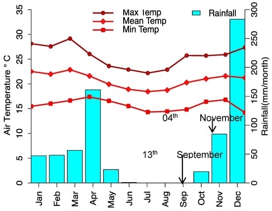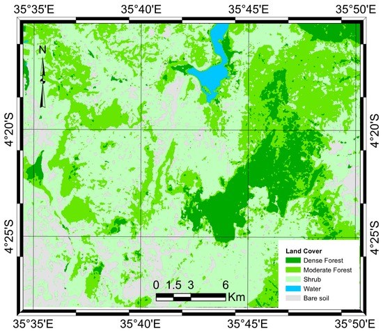 The study is based on Bereko and Duru-Haitemba forest reserves in Babati district, Manyara region, northern Tanzania. The reserves are located between latitude 4°15′ S and 4°30′ S, and between longitude 35°35′ E and 35°50′ E within lake Manyara basin (Figure 1). The mean annual rainfall is 700 mm/year and the average rainfall of about 60 mm/month (Figure 2). The mean monthly air temperature is 23 °C per day. The forest reserves can be categorized into six main land cover/use types: water (e.g., lakes and streams), shrubs, natural dense forest and moderate forests/woodlands (Table 1). The land categorized land cover types have been adopted from a 1996 land use/cover map of Singida (Sheet Index SB 36-4).