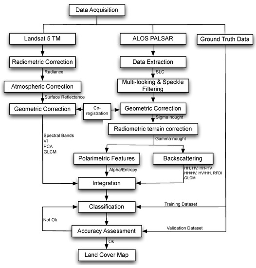 - Wijaya, A.; Gloaguen, R. Fusion of ALOS Palsar and Landsat ETM data for land cover classification and biomass modeling using non-linear methods. In Proceedings of the 2009 IEEE International Geoscience and Remote Sensing Symposium, Cape Town, South Africa, 12–17 July 2009.