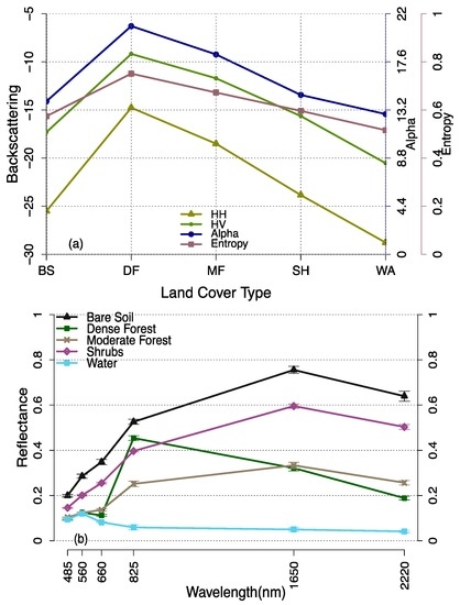 The Alpha-Entropy decomposition of ALOS PALSAR was generated from eigenvalues-based target decomposition. In the alpha-entropy plane, lower values of alpha are depicted with relatively higher entropy values especially for dense forest, moderate forest and shrub land cover classes (Figure 6, Table 5). Forest land cover classes (both dense and moderate forest) demonstrate higher alpha values compared to other classes under study (Figure 6b). Landsat surface reflectance values of the training samples indicates higher values on the near infrared (NIR) band for the dense forest cover with lower values in Red band (Figure 5b). Water indicates higher values for Green band and lower values in other wavelength bands (Figure 5b).