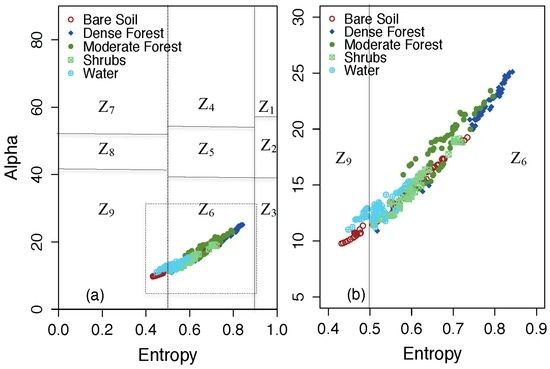 (a,b) Cloude-Pottier decomposition of the training samples of the selected land cover classes (Table 1). Z1, Z4 and Z7 are characterized by double bounce scattering, Z3, Z6 and Z9 by surface scattering, and Z2, Z5 and Z8 by volume scattering. The black dashed polygon indicates the extent of Figure 5b; a zoomed view of the training samples distribution on the Alpha-Entropy plane.