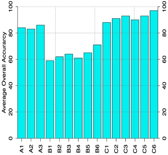 The classification results attained based on different data categories (A–C), for Landsat, ALOS PALSAR, their derivatives and integration are presented in Table 7 and Figure 7 respectively. Table 7 depicts classification results of the SVM classifiers for each data categories (A–C) in terms of the PA, UA and F1 score index. The results are for all land cover classes under study. In Table 7 both category A and C provides the best classification accuracy in terms of PA, UA and F1 score index for all land cover types. Category B indicates poor PA for dense forest and bare soil covers, with lower UA values for dense forest, moderate forest and bare soil land cover classes. Lower F1 score index values are obtained for dense forest and bare soil covers. The overall classification accuracy for all data categories are indicated in Figure 7.