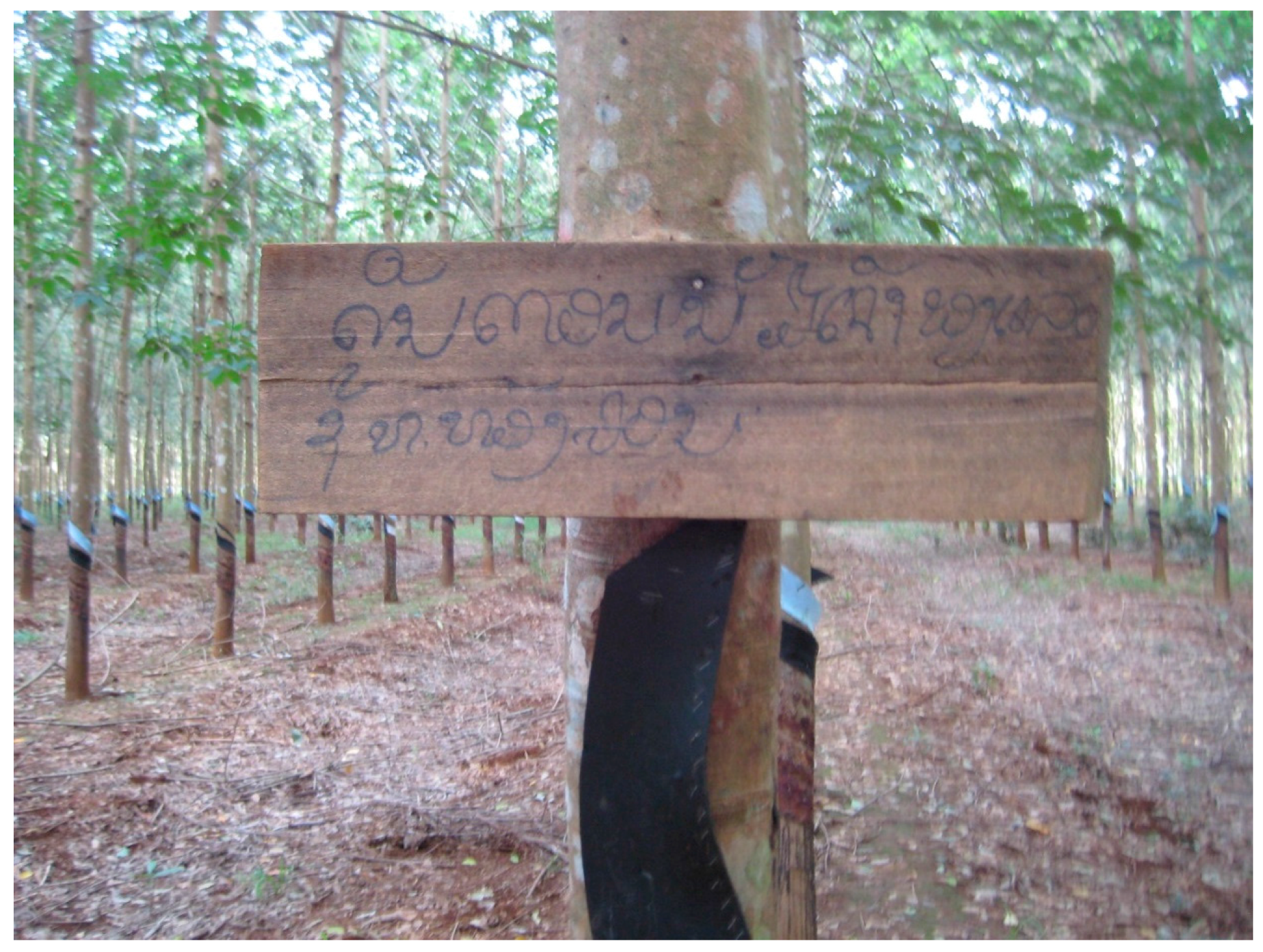 - Kenney-Lazar, M. Plantation rubber, land grabbing and social-property transformation in southern Laos. J. Peasant Stud. 2012, 39, 1017–1037. [Google Scholar] [CrossRef]