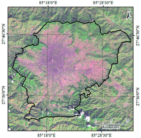 The Kathmandu valley, the largest urban agglomerate of Nepal, is located between 27°34′33″ and 27°49′4″ N latitudes and 85°11′19″ and 85°34′57″ E longitudes, covering an area of 654.7 km2. The valley consists of three major cities: namely, Kathmandu, the capital city; Bhaktapur and Lalitpur, ancient cultural gem cities. The population density is 2793 people per square kilometer as of the 2011 census. The average elevation is approximately 1400 m above sea level. This bowl-shaped valley is filled with more than 550 m thick lacustrine and fluvial deposits [51], which make it prone to land subsidence. The Landsat image of the Kathmandu valley is shown in Figure 1.