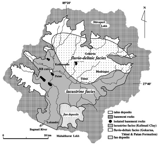 - Sakai, H. Stratigraphic division and sedimentary facies of the Kathmandu Basin group, Central Nepal. J. Nepal Geol. Soc. 2001, 25, 19–32. [Google Scholar]