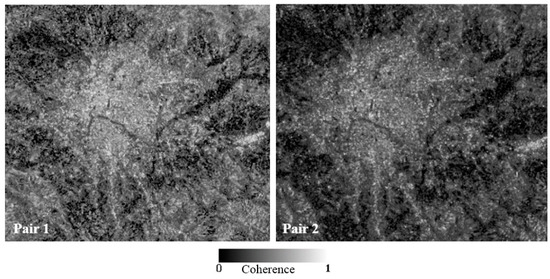 The coherence image of each pair for the study area is shown in Figure 3. A coherence value close to 1 (i.e., white color) indicates that there is no phase noise, whereas a coherence value of 0 (i.e., black color) indicates that there is only phase noise. Areas with high coherence (coherence value 1) display clear interferogram patterns in the interferogram image, whereas areas with low coherence (coherence value 0) displays noisy interferogram patterns. Good coherence is seen in both of our pairs; therefore, they can be considered for interferogram generation.