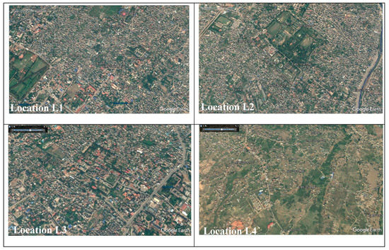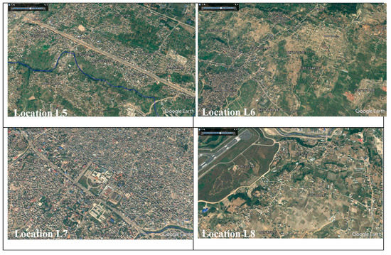 Location L1, in central Kathmandu, shows the maximum amount of subsidence (17 cm). It is a mixed-use development area (a type of urban development that comprises an amalgamation of residential, commercial, cultural, institutional, and/or industrial uses, along with their physical and functional integration, including pedestrian connections [64]). Location L2—Chauni and periphery—is an old settlement area with an army camp and ancient museum covering most of the subsidence zone. Location L3—Lalitpur—is also an old mixed-use settlement area. Location L4—Imadol and periphery—is a location on the outskirts of the Kathmandu city urban center, which is gradually changing from farmland/cropland into urban land use. This location also has a small number of brick kilns, which might be affecting the ground surface elevation. Location L5—Thimi and periphery—is a mixed-use settlement area with croplands on the north-eastern side of the subsidence zone. Location L6—Madhyapur Thimi—is mostly cropland with a few residential areas (spots), but is gradually being urbanized by land plotting. Location L7—New Baneshwor and Koteshwor—are also mixed-use settlement areas, with the majority being commercial buildings. Location L8—Gothatar—mostly consists of croplands with a few residential buildings, along with a small northern portion of the international airport runway. The outskirts of the valley are mostly rural, but urbanization is slowly spreading from the center of the valley towards the periphery. A Google Earth image displaying portions of location is shown in Figure 6.
