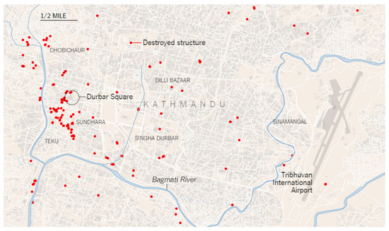 Grading map showing the location of destroyed structures due to 2015 Gorkha earthquake indicated by red dots. (Source: European Commission Copernicus Emergency Management Service).