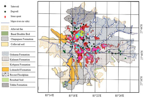 Geology of the Kathmandu valley: the Kathmandu valley is surrounded by the Shivapuri mountain range (2732 m) in the North, the Phulchauki mountain range (2762 m) in the south, the Nagarkot mountain range (1895 m) in the east and the Chandragiri mountain range (2356 m) in the west [52]. The main geological composition of the Kathmandu valley is quaternary sediment over basement rock [53]. The basement rock is formed by Precambrian to Devonian rocks, which mainly consist of limestone, dolomite, slate, metasandstone, phyllite, marble, schist, quartzite and garnet-schist [54]. The quaternary sediment consists of thick (more than 650 m deep), semi-consolidated fluvio-lacustrine sediments from the Pliocene to the Pleistocene age [54]. It is composed of fine-to coarse-grained sand, gravel, clay, silt, peat, lignite and diatomite [55]. The geological map of the Kathmandu valley is shown in Figure 2.