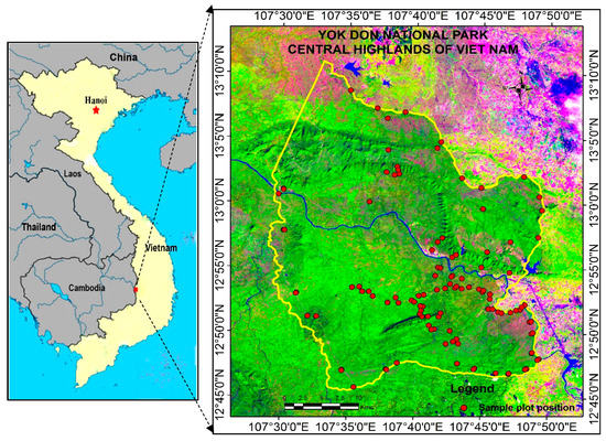 - Figure 1. Location map of the study area with sample plot positions. The RGB color composite (right figure) is based on Landsat 8 OLI data, and the boundary of Yok Don National Park is shown in the yellow polygon.