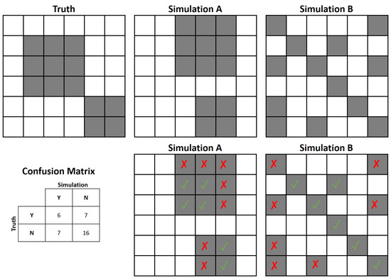 Example of two simulations (A and B) and their comparisons to observed truth. Grey boxes represent changes in a map class. Simulation A and B have an identical confusion matrix, and therefore identical quantity and allocation disagreement (also identical kappa). However, Simulation A has perfect configuration accuracy (i.e., one patch of 9 boxes and another with 4) and Simulation B does not.