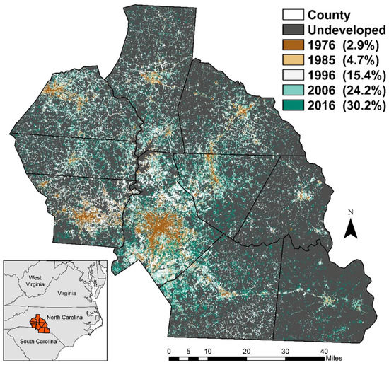 Ten counties surrounding Charlotte, North Carolina, were used to test each model’s simulation accuracy (Figure 2). Charlotte is a major economic center that has experienced substantial urban development in the past four decades, increasing from two percent of the total study area in 1976 to approximately 30 percent in 2016. Located within the Southern Piedmont physiographic province, the region’s mild topography has allowed for some of the densest road networks within the southeastern United States [39]. Zoning plays a major role in shaping the location of new urban developments as there are few environmental constraints to construction [40].
