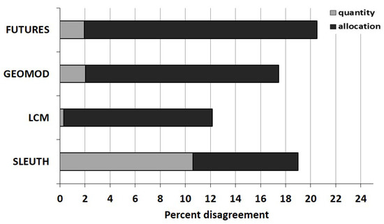 Allocation disagreement is error due to differences in the location of map categories [13]. The amount of allocation disagreement is always an even number due to the enjoinment of an omission error of one class and a commission error of another. This accuracy metric provides an estimate of how well each model simulates pixels spatially, with some allocations having greater similarities to the observed land cover than others. Following Pontius and Millones (2011) [13], allocation disagreement was computed for the urban development class (a) as:
