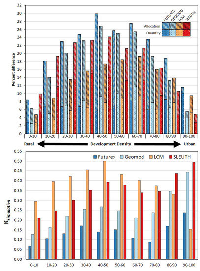 Overall, SLEUTH has the lowest allocation disagreement but its total disagreement (quantity plus allocation, Figure 3) was 19.0 percent. With an average allocation disagreement of 11.87, the LCM had the least total disagreement (12.7 percent). FUTURES and GEOMOD had higher allocation disagreements than the other two models (Table 3), but total disagreement for GEOMOD and FUTURES was 17.45 percent and 20.49 percent, respectively. Across development densities, LCM and SLEUTH typically had the lowest allocation disagreement (Figure 4). When evaluated in terms of total disagreement, LCM performed best in development densities of 80 percent or less, while SLEUTH outperformed the other models with development densities greater than 80 percent (Figure 4).