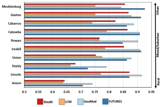 Our results indicate that allocation accuracy does not automatically confer configuration accuracy, indicating trade-offs between the two. FUTURES best simulated landscape-level configurations of development, but at the trade-off of lower allocation accuracy. Comparatively, GEOMOD, LCM and SLEUTH tend to agglomerate new growth predominantly adjacent to existing development in a “tree ring” type of pattern (Figure 6). This creates homogenous development areas and fails to capture heterogeneous patterns of development, where new patches of spontaneous growth emerge. FUTURES patch growing algorithm maintained a greater degree of landscape heterogeneity and best simulated patch based configurations of development. Configuration accuracy is indiscriminate with regards to cell level transitions, but can be used to describe the emergence of macro-level outcomes [33,73]. Therefore, while calculating configuration disagreement is not suitable for small areas (e.g., the km grid analysis), county level analyses demonstrate that FUTURES and GEOMOD are better suited for specific development densities along the urban to rural gradient (Figure 5). FUTURES simulated landscape configurations of 85 percent or greater LSI in seven of the ten counties when compared to configurations observed in 2016. Furthermore, FUTURES simulations had LSI values below 75 percent for only two predominantly rural counties. These high LSI values suggest that when modeling objectives are focused on accurately representing landscape-level configuration, FUTURES is likely the most suitable model. In general, GEOMOD simulated landscape configurations well, especially in counties trending more rural. However, LSI values for all four models were lower in predominantly rural areas, suggesting further investigation and modeling improvements are needed to better project new urban development in rural contexts.