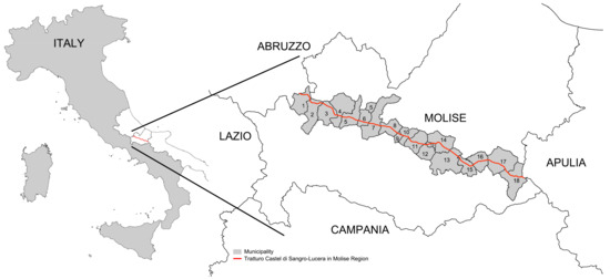 Molise is crossed by seven drove roads linked to one another by connecting elements, three tratturelli and two bracci [46]. The Tratturo Castel di Sangro-Lucera (Figure 2) has a linear length of 127.4 km, from the locality of Vallesalice (Castel di Sangro, L’Aquila, Abruzzo) at 850 m a.s.l., ending up in the locality of Perazze at 117 m a.s.l. (Lucera, Foggia, Apulia) [47].