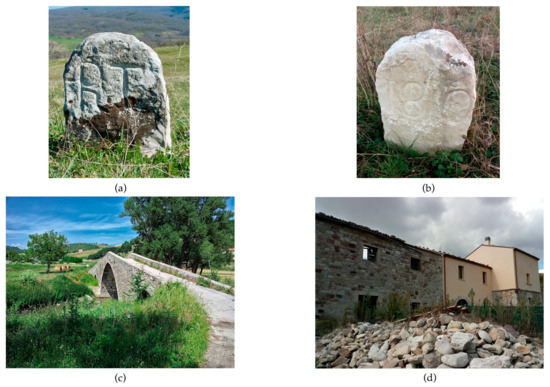 A drove road milestone nearby the locality Torre Santa Maria (Pescolanciano, IS): (a) the side with the capital letters RT for Regio Tratturo (Royal drove road), (b) the side with the date of positioning 1810. Capecelatro’s Atlas Sheet 280, Bonamici’s reinstatement Table LXIII; (c) Ponte di Toro (Toro—CB), Tablet IGM 162 I-SO; (d) Taverna di Pietracatella (Pietracatella—CB) IGM 162 I-SE, Bonamici’s reinstatement Table VI, Capecelatro’s Atlas Sheet 292.