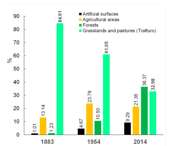 Percentage of land use squatting classes concerning the entire tratturo in the Bonamici’s reinstatement (1883) and in the maps made for 1954 and 2014.