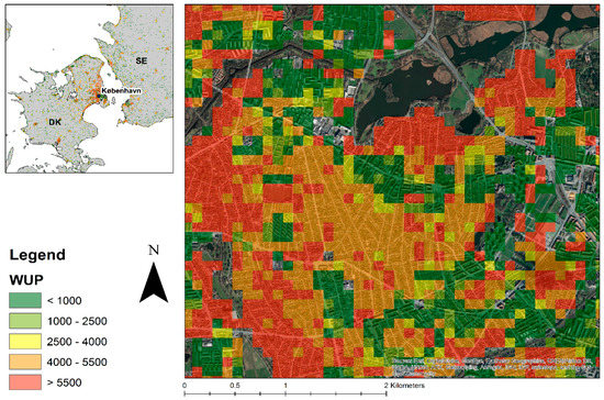 Weighted Urban Proliferation (WUP) values for LUISA population 2010 reference scenario, using a 2 km horizon of perception for a suburb of Copenhagen, Denmark. Densely populated places (apartments) show low WUP values while less populated “suburb” areas (typically house and garden) are associated with higher WUP values.