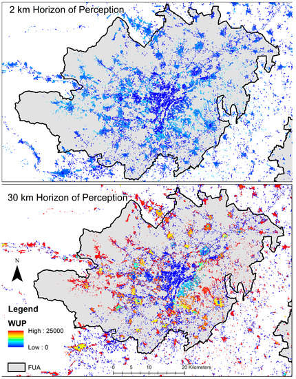Our exploration of the effect of using various horizons of perception (illustrated in Figure 2) indicated that higher horizons of perception led to higher WUP values. The maximum EU WUP values increased from 8580 for a 2 km horizon of perception to 33,000 for a 30 km horizon. However, the increase in WUP value was spatially uneven, with very dense urban areas seeing almost no changes while small, isolated clusters of built-in cells saw a much higher increase in WUP with increasing horizons of perceptions.