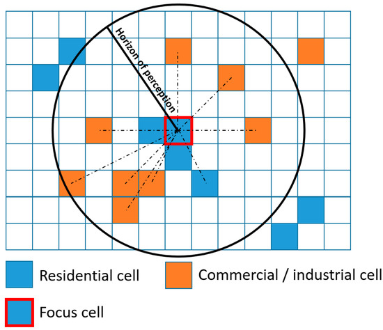 The horizon of perception is a critical element of the WUP. It corresponds to the maximum distance at which a focus cell (residential cell in our adapted method) is influenced (perceived sprawl) by the presence of other built-up cells (both residential and commercial/industrial). Figure 3 illustrates this concept.