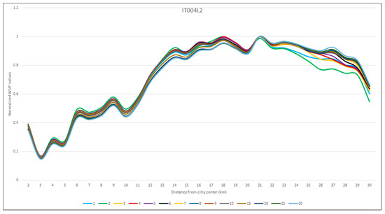 Figure 4. Normalized average WUP values per concentric rings extending from the city center, calculated for increasing horizons of perception for the city of Turin, Italy. - (2)