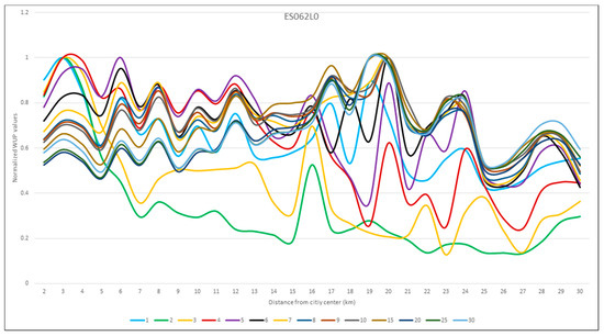 The WUP profile for the city of Kavala (blue line in Figure 16) shows very low WUP values in the city center, then slowly increasing up to a distance of 4 km and following a wave pattern while remaining in the lower European WUP distribution. This wave pattern indicates the presence of sparse, dense aggregations of population (villages) around the city center.
