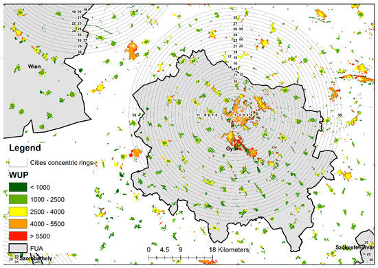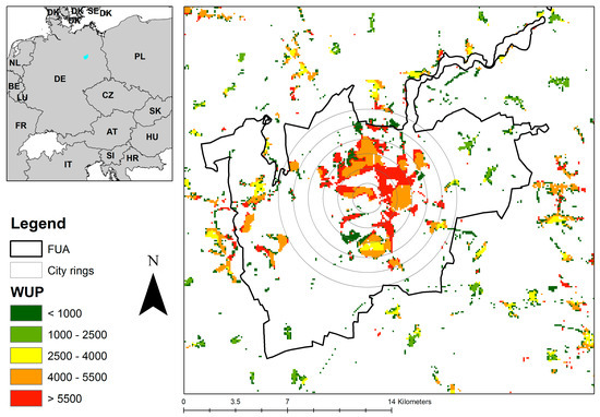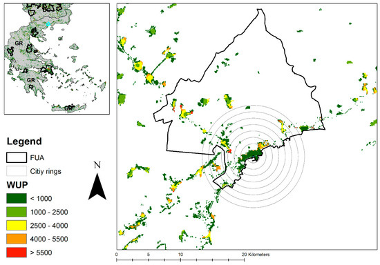 A preliminary “visual analysis” of the results at the pixel level (illustrated in Figure 1) suggests that the calculated WUP values follow a spatial pattern consistent with the theory of [31]. Densely populated areas display low WUP values (green) while less dense, more sparsely populated areas display higher values (orange and red).