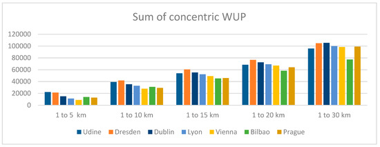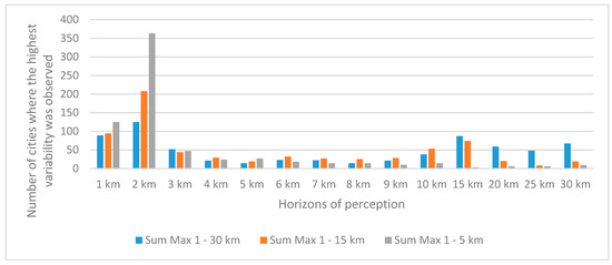 From this analysis, we summed the number of cities, which displayed the highest variability (sum of absolute differences) for each investigated horizon of perception. For most cities, a horizon of perception of 2 km provided the highest sum of absolute difference in average WUP when accumulated across concentric rings from 1 to 30 km distance from the city centers (see Figure 7). We observed that this value of horizon of perception also provided the highest sum of absolute difference when considering concentric rings from 1 to 5 km, and from 1 to 15 km.