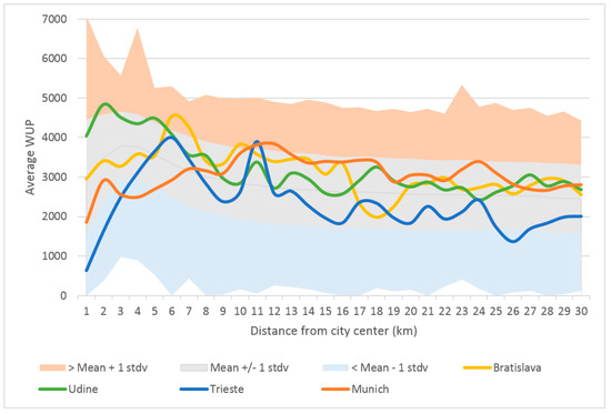 Variations in average WUP per concentric rings across cities using a 2 km horizon of perception. The faint grey line represents the average WUP across all EU cities, the blue area represents zones with average WUP values inferior to the mean by more than one standard deviation, and the area in red represents zones with average WUP values superior to the mean by more than the standard deviation.