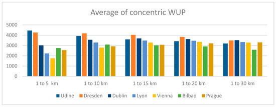 Average of average WUP aggregated for concentric rings ranging from 1 to 5 km distance to 1 to 30 km distance and 1 to city’s edge. Cities are listed in order of sprawl based on the European Environment Agency and European Commission’s Joint Research Centre’s 2006 report.