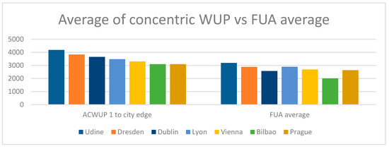 Assuming that the correspondence ratio between our classification and the work [28] extends to the rest of cities in the EU28, the averaged concentric WUP could provide a cheap, first-pass indicator to classify cities as a function of their sprawl.