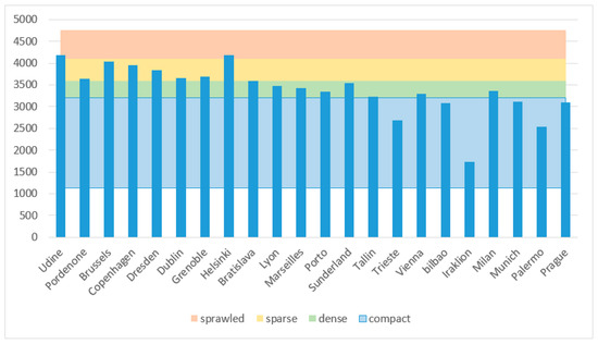 Each of the three candidate indicators were calculated for all 672 cities in the EU28. The obtained values were then compared with the work published on urban sprawl by the European Environment Agency and European Commission’s Joint Research Centre [8], who ranked 22 European cities based on their level of sprawl (see Table 1). This report provided a ranking, split into a 4-category classification, of the most sprawled and compact cities in Europe, by combining six indicators taking into consideration elements such as the growth of built-up areas, the share of residential areas, population density, and growth rates. It identified Udine, Italy as the most sprawled city and Bilbao, Spain as the most compact. Although the European Environment Agency published an updated report on urban sprawl in Europe in 2016, this updated report did not provide any ranking of cities based on their level of urban sprawl, and could not be used as an updated reference in our analysis.