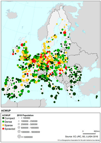 This paper describes an attempt at characterizing urban sprawl in urban areas at a pan European scale, by presenting a new indicator, the Averaged Concentric Weighted Urban Proliferation (ACWUP) index. This index is calculated by aggregating the “sprawl profile” of urban areas, derived from an adapted version of Jaeger’s WPU index [28]. Our analysis made use of EU28-wide, 100 m resolution gridded population and land-use data, produced by the European Commission LUISA Territorial Modelling Platform1 under the 2013 reference scenario, for the year 2010 (see https://ec.europa.eu/jrc/en/luisa).