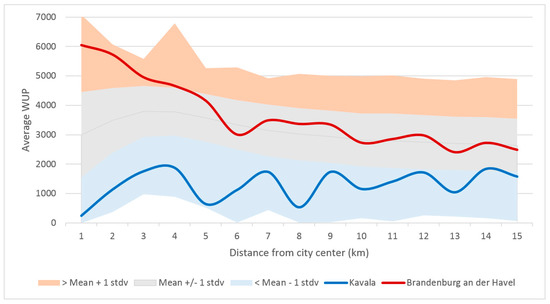 We propose the ACWUP be used as a first-pass investigation of sprawl and be complemented by an analysis of the average WUP profile to identify local spatial variability. For example, a closer observation of the average WUP variations between Kavala (Figure 14) and Brandenburg an der Havel (Figure 15) provides a clearer picture of their structure.
