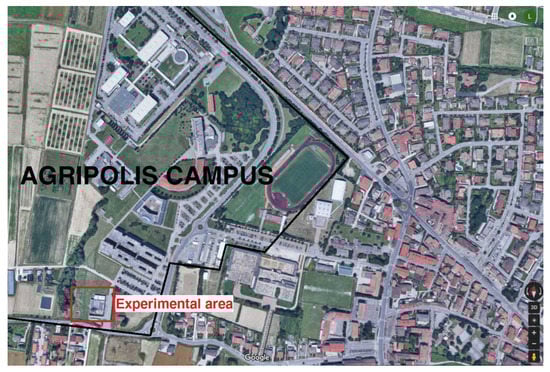 A Google Maps view of the Agripolis Campus of the University of Padova and the experimental area in which the two bioretention solutions (bioretention pond and rain garden system) are located.