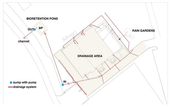 Plan of the experimental area with the position of the bioretention pond (BP) and the sumps where the water samples were collected (BP, IN, OUT). The rainwater drainage system with the path of water from storm drains is also reported. The overflow water was collected in the inflow sump (IN) and pumped in the BP; from the outflow sump (OUT), the water was pumped in a channel of the urban surface drainage system.