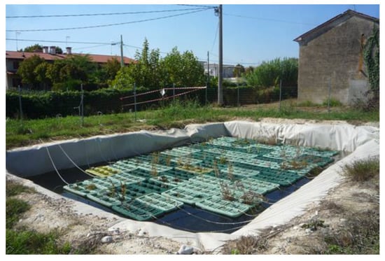 On July 2011, when the pond was almost full of water (102.5 mm in depth), 66 self-floating elements (Tech-IA®, Padova, Italy), supporting four plants each, were laid down on the water surface. Tech-IA® is a rectangular panel (0.50 × 0.90 m) produced in ethylene-vinil acetate (EVA), with eight gridded windows in which plants can be anchored. Its mass is 1732 g, and it may support a load capacity up to 20 kg [,]. The single elements were linked to each other, covering more than 70% of the storage basin surface (Figure 3).