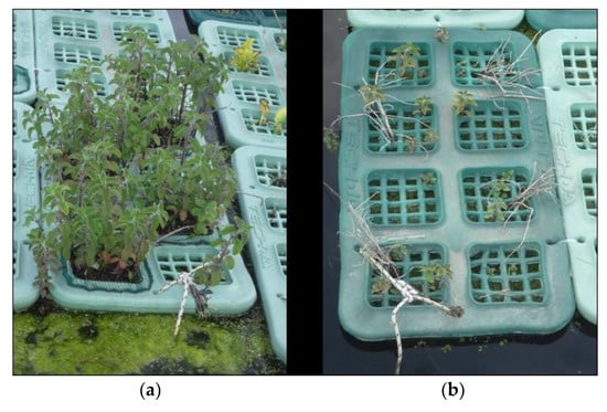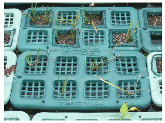 The following 11 herbaceous perennial helophyte plants, with ornamental features, were used: Alisma parviflora Pursh., Bacopa caroliniana (Walt.) B.L. Robins, Caltha palustris L., Canna indica L., Iris ‘Black Gamecock’ (Louisiana Iris group), Lysimachia punctata L. ‘Alexander’, Mentha aquatica L., Oenanthe javanica Blume (DC.) ‘Flamingo’, Phalaris arundinacea L. ‘Picta’, Sagittaria sagittifolia L., and Typha laxmannii Lepech. (hereafter also called ALSSU, BAOCA, CTAPA, CNNIN, IRISS, LYSPU, MENAQ, OENJA, PHAAP, SAGSA and TYHLX, respectively according to their EPPO codes (see http://eppt.eppo.org/). For each species, six floating elements were adopted; the plants were set with the root system free in the water in three of these elements, while, in the others, the plants were set with roots confined in about 0.4 L of expanded clay, contained in plastic nets settled in place of the grids (Figure 4), through which roots could grow and reach the water.